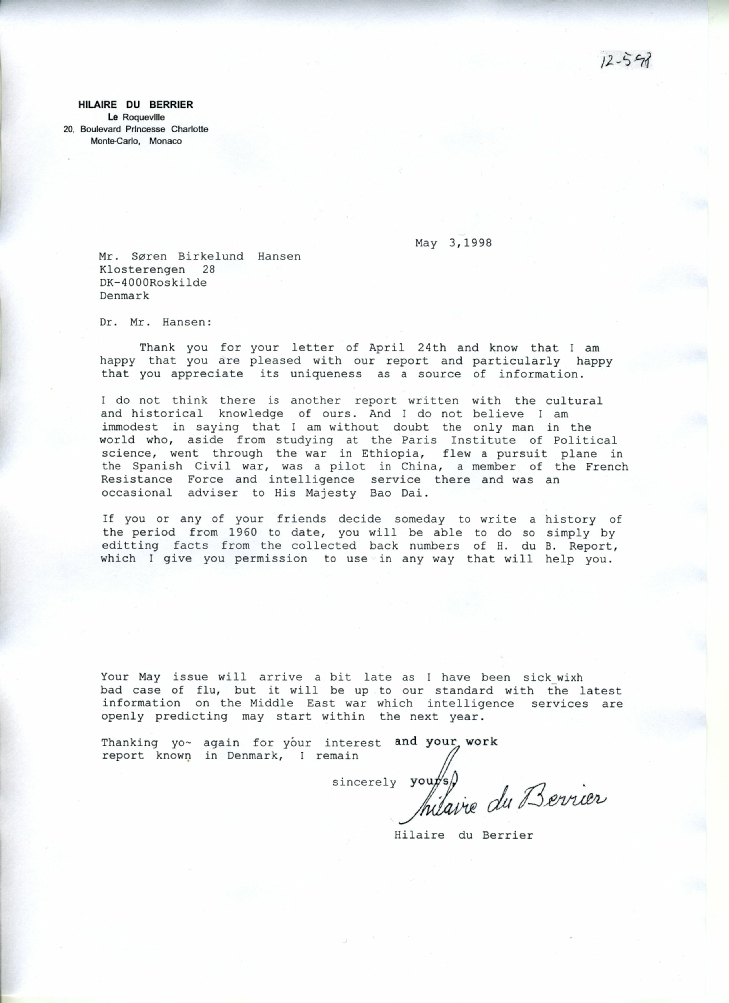 Colonel Marcel Mingant, second in command of the French Intelligence in China and the holder of the Freedom Medal, for rescuing American aviators downed behind enemy lines, wrote of H. Du B. In a report to the French War office: "I regard my friend du Berrier as the person who would have been most likely to succeed in intelligence … He would have liked to work for his country but never encountered men in its service who were intelligent enough to understand him. Whit one of his associates, John Cheng, he took part in the underground transmission of information to Chungking. The transmitter was in his room and remained there until I took it away. I must also say at once that at no time did du Berrier reveal my identity under Japanese torture. Thus his courage saved me and my organization from being destroyed immediately and I, myself, was able in another territory (North Vietnam) to save the lives os several American pilots who were prisoners of the Japanese. I consider that it was du Berrier who, indirectly. Permitted this…. His activity at this time proved to me that, directed by people of his country, du Berrier could have been the best intelligent agent in the Far East."